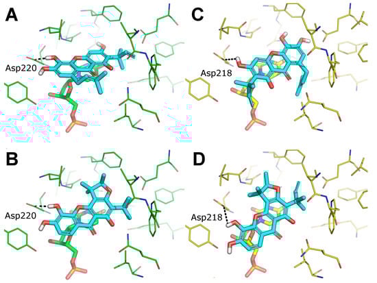The possible binding mode of the most interesting TS inhibitors identified by virtual screening and in vitro tests, i.e., alvaxanthone and rheediaxanthone B, was investigated by molecular docking against human and C. elegans TS. Compared to the virtual screening settings, here, we stored a larger number of binding poses of each compound to enrich our analysis with statistical significance. Overall, both compounds proved to bind within the TS catalytic site, in close proximity and in stacking conformation to the co-crystallized dUMP cofactor. Notably, both compounds adopted a very similar binding mode against the catalytic site of TS from both human and C. elegans, which is not surprising according to the high degree of sequence and structural identity between TS from the two species [48]. Besides stacking to dUMP, the major anchor point is the side chain of Asp220 (in C. elegans Ts) or Asp 218 (in human TS), which is H-bonded to a hydroxyl group connected to the xanthone ring (Figure 5). Similar to docking poses, also docking scores highlighted that both alvaxanthone and rheediaxanthone B bind with comparable affinity to each protein (chemgauss4 score for alvaxanthone: −8.60 (C. elegans) and −8.91 (human); rheediaxanthone: −8.10 (C. elegans) and −8.50 (human)). These theoretical results are in agreement with experimental data above and may facilitate the design of TS inhibitors with improved features.