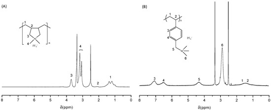 The chemical structure of three PILs is shown in Scheme 1. Figure 1 shows 1H NMR spectra of three PILs. It is observed that the three PILs have completely polymerized and no sharp characteristic peaks corresponding to IL monomers have been observed except for two sharp peaks at 2.51 ppm and 3.34 ppm due to DMSO-d6 and H2O [18]. From the 1H NMR spectra of P[DADMA][PF6] in Figure 1A, it can be seen that a broad peak at 1.16–1.37 ppm corresponds to the hydrogen of backbone, a broad peak at 3.18 ppm corresponds to the hydrogen on the methyl group linked with the nitrogen atom, and a broad peak at 3.79 ppm corresponds to the hydrogen on the carbon heterocycle. From the 1H NMR spectra of P[VBTMA][PF6] in Figure 1B, it can be seen that a broad peak at 1.36–1.64 ppm corresponds to the hydrogen of backbone, two broad peaks at 6.50 ppm and 7.11 ppm correspond to the hydrogen on benzene ring, a broad peak at 4.34 ppm corresponds to the hydrogen on the methylene group attached to the benzene, and a broad peak at 2.90 ppm corresponds to the hydrogen on the methyl group of ammonium ions. From the 1H NMR spectra of P[C2VIm][PF6] in Figure 1C, it can be seen that a broad peak at 1.37–1.69 ppm corresponds to the hydrogen of backbone and the methyl group at the tail end, a broad peak at 4.12 ppm corresponds to the hydrogen on the methylene attached to the imidazole ring, and three broad peaks at 7.18 ppm, 7.79 ppm and 9.01 ppm corresponds to the hydrogens on the imidazole ring [20].