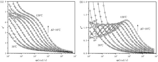 Because the ER property is associated with the interfacial polarization of ER particles in carrier liquid [28], to understand the reason of the influence of tethered countercations on ER property, we employed dielectric spectroscopy to analyze the polarization characteristic of PIL ERFs. Figure 7 shows the angular frequency (ω) dependence of dielectric constant (ε′) and loss (ε″) of three PIL ERFs at different temperatures. At room temperature, three ERFs display dielectric dispersion but no relaxation peak. At relatively high temperatures, the relaxation peak appears and the peak position moves towards high frequency as the temperature rises. According to the analysis in our previous report [29], this relaxation process is attributed to the interfacial polarization induced by the movement and accumulation of dissociated PF6− at the interface between PIL particles and silicone oil. To get good ER property, it has required ER particles to have not only large interfacial polarizability but also suitable polarization rate because ERFs are usually work under the simultaneous stimuli of electric and shearing fields [28]. The polarizability can be reflected by the dielectric strength (∆ε′= ε′0 − ε′∞, where ε′0 is the limit value of ε′ below the relaxation frequency and ε′∞ is the limit value of ε′ above the relaxation frequency), the polarization rate can be reflected by the dielectric relaxation time (λ = 1/ωmax, ωmax is the angular frequency at ε’’ peak position). The polarization in phase with the exciting electrical field is available for ER effect. Even if the ERFs are subjected to a DC electric field, the λ values of particle polarization has been proposed to locate in or near a suitable range of 1.6 × 10−3 − 1.6 × 10−6 s because too fast or too low polarization rate is easy to cause interparticle repulsion or insufficient interaction under shear field. As λ decreases within 1.6 × 10−3 − 1.6 × 10−6 s and large ∆ε′ is achieved, a strong ER property can be obtained [28]. To obtain the values of λ and ∆ε′, we fit the data in Figure 7 by the solutions of ε’ and ε’’ of the dielectric relaxation function below (Equation (1)) [30].