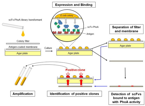 Schematic diagram of the procedure describing the colony assay with a single-chain variable fragment fused to the N-terminus of bacterial alkaline phosphatase (scFv-PhoA). ScFv-PhoA fusions are expressed and secreted from E. coli. Those with the desired affinity bind the antigen beneath the colonies and are detected directly after applying the alkaline phosphatase substrate. Positive clones are identified as the colonies matching the positive signals on the membrane.