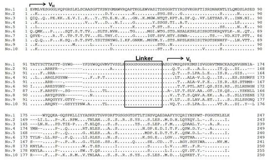 The DNA of each scFv from the ten clones (Figure 3) was sequenced. The inferred amino acid sequences of the ten clones are shown in Figure 5. Every clone contained the complete scFv structure consisting of heavy-chain variable domain (VH), linker, and light-chain variable domain (VL). All sequences were unique, indicating that diversity of the scFv-PhoA library was maintained throughout the assay. These results show that genes encoding scFv-PhoA fusions with binding affinity for the antigen could be successfully isolated using our method.