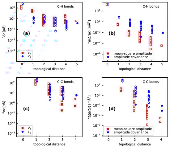 Isotope effects on the C–H (a) and C–C (c) bond lengths, as well as the mean-square vibration amplitudes and the covariance of the amplitudes with for C–H (b) and C–C (d) bonds, for all H/D isotopic substitutions in the molecules investigated in Section 3.2. The topological distance is the number of bonds between the present bond and the H site, that is, 0 for the C–H bond itself, 1 for geminal bonds, 2 for vicinal bonds and so forth. The graphs show the absolute values of the isotope effects, full and hollow markers indicate positive and negative values, respectively. The black markers with grey shadings show the values for pyridine. See Section 4 for computational details.