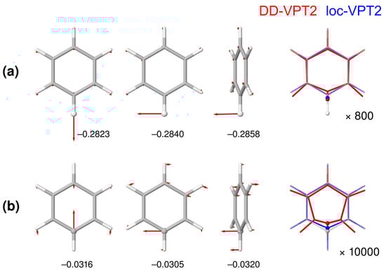 The substitution in benzene is particular, given that the substitution site is involved in three bonds rather than just one. Calculated and experimental NMR isotopic shifts for this substitution are presented in Table 4, isotope effects on selected geometry parameters, in Table 5. Figure 3 shows the three leading difference-dedicated vibration modes as well as the change of the geometry of benzene for both a single H/D and a single substitution. We remark that descriptions of all difference-dedicated vibration modes for the molecules discussed in Section 3.1 and Section 3.2 in Molden [68] format are available in the SI of Reference [30] and for the molecules discussed in Section 3.3, in the SI of the present article. The three difference-dedicated vibration modes shown for the H/D substitutions are strongly localized to the H site, similarly as for example, the corresponding mode in pyridine, which are presented in Reference [30]. In contrast, the modes for the are more delocalized over the molecule, which means that loc-VPT2 will not be able to describe the cahnge of the vibration amplitudes properly in this case. The situation for the change of the geometries is analogous—for a H/D substitution, the dominating change is the shortening of the C–H bond length, and DD-VPT2 and loc-VPT2 provide similar descriptions (see Figure 3a). For a substitution, in contrast, loc-VPT2 cannot properly describe the shortening of the C–H bond (see Figure 3b): since the position of the H atom is fixed this bond can not get shorter in terms of values as it should but gets even a bit longer (see Table 5). However, the IE on (CH) becomes negative as it should be, and the value is close to its DD-VPT2 pendant. Obviously, the amplitudes of the lateral vibrations manage to “cover up” to some extent for the missing geometric flexibility in loc-VPT2. As a consequence, the loc-VPT2 isotope shifts (see Table 4) are indeed smaller than the corresponding DD-VPT2 values but the differences are moderate. The MSgD and root-of-mean-square (RMS) deviations are even smaller for loc-VPT2 than for DD-VPT2 (again, missing temperature effects may affect the results). However, loc-VPT2 incorrectly predicts to be larger than , in distinction to DD-VPT2.