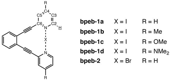 - Carlsson, A.C.C.; Gräfenstein, J.; Laurila, J.L.; Bergquist, J.; Erdélyi, M. Symmetry of [N–X–N]+ halogen bonds in solution. Chem. Commun. 2012, 48, 1458–1460. [Google Scholar] [CrossRef]