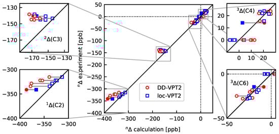 Figure 5 shows the DD-VPT2 and loc-VPT2 NMR isotopic shifts as compared to experiment (0 K), the numerical values are found in Table S8. A summary of the results is presented in Table 2. Similarly as in Section 3.1, the differences between DD-VPT2 and loc-VPT2 results are relatively small, and there is no clear superiority for any of them. Both the DD-VPT2 and the loc-VPT2 values reflect the substituent effects on (C2) reasonably well but, as with norbornane and adamantane, the regression coefficient between calculated and experimental values is slightly higher for DD-VPT2 than for loc-VPT2.