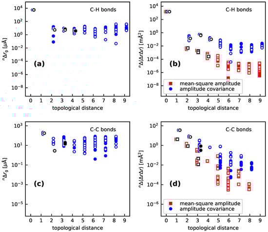 Isotope effects on the C–H (a) and C–C (c) bond lengths, as well as the mean-square vibration amplitudes and the covariance of the amplitudes with for C–H (b) and C–C (d) bonds, for all H/D isotopic substitutions in the molecules investigated in Section 3.1. The topological distance is the number of bonds between the present bond and the H site, that is, 0 for the C–H bond itself, 1 for geminal bonds, 2 for vicinal bonds and so forth. The graphs show the absolute values of the isotope effects, full and hollow markers indicate positive and negative values, respectively. Calculations done at the B97X-D//pc-2 level of theory.