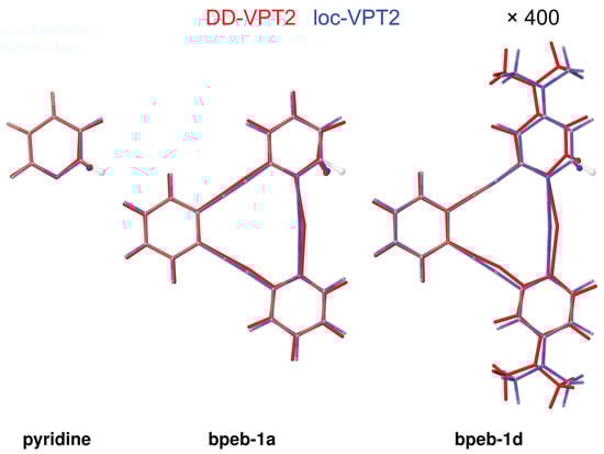The isotope effect on the geometries can be visualized in a similar way as shown above for benzene (see Figure 3). Figure 7 shows the change of the geometry for pyridine as well as bpeb-1a and bpeb-1b for both DD-VPT2 and loc-VPT2. Even though the largest changes in the geometry are found around the substitution site one finds that the geometry of the pyridyl moiety is somewhat different in the three cases. In addition, for the two bpeb-derivative complexes, there are global changes in the geometry, which are facilitated by the flexibility of the ethynyl [37] and [NXN] moieties. These changes are substituent-dependent, one finds that they are considerably more distinct in bpeb-1d than in bpeb-1a. One has, however, to bear in mind that the geometry changes are exaggerated by a factor of 400 in Figure 7, that is, the actual geometry changes are rather small both in bpeb-1a and bpeb-1d. Altogether, in spite of some minor peculiarities the behaviour of the vibration hole in the bpeb-derivative complexes largely resembles that for the molecules discussed in Section 3.1.