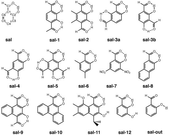 In the sets of molecules investigated in Section 3.1 and Section 3.2, we found the vibration holes to be well localized around the substitution site. For all these molecules (except the case of an substitution in benzene), the substitution site was involved in one covalent bond only and not part of for example, an intra-molecular hydrogen bond. However, NMR isotopic are potentially valuable probes for the investigation of inter- and above all intramolecular weak interactions, since they reflect the vibration pattern motif and, in extension, the molecular potential around the substitution site. Several authors, among others Limbach and co-workers (see e.g., References [17,18,19,59]) and Hansen and co-workers (see e.g., References [14,15,20,58,72,73]) have studied NMR isotopic shifts in hydrogen-bonded systems. It is thus interesting to know what the vibration hole looks if the atom at the substitution site is part of an intramolecular hydrogen bond. Recently, Hansen et al. [20] investigated a number of conventional as well as sterically compressed salicyl aldehyde (sal) derivatives as shown in Figure 8 (our numbering is consistent with that in Reference [20]; our stem compound sal is compound 13 there). In distinction to the set of bpeb-derivative complexes studied in Section 3.2, the sal derivatives in Reference [20] show a much more diversified range of substituents, comprising electron-donating and -withdrawing groups as well as bulky groups that sterically constrain the HC=O···OH moiety and additional hydroxyl groups that can involve in (weak) hydrogen bonds. Also, the substituents in the sal derivatives are not restricted to one position as in the bpeb-derivative complexes. The study in Reference [20] was aimed at finding theoretical and experimental indicators for the strength of the intra-molecular hydrogen bonds. Among other things, the (C2) values of the sal derivatives were acquired for that purpose, which proved to vary by several 100 ppb as compared to just 30 ppb for the experimental isotopic shifts in bpeb-1a to bpeb-2. The strong substituent dependence of the (C2) in sal to sal-12 makes this set of compounds an interesting testbed for the theoretical prediction of NMR isotopic shifts as well for the investigation of the vibration hole.