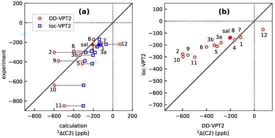 NMR isotope shifts for sal and sal-1 to sal-12 as calculated with DD-VPT2 and loc-VPT2, respectively. (a) DD-VPT2 and loc-VPT2 versus experimental values, (b) loc-VPT2 vs. DD-VPT2 values. The sal derivatives are denoted with their numbers, for example, 3a stands for sal-3a. The full markers are for the stem compound sal. See Section 4 for computational details.