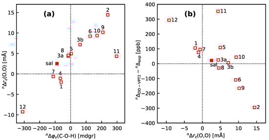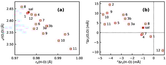 Calculated geometry parameters for sal and sal-1 to sal-12. (a) vs. , (b) vs. as calculated with DD-VPT2. The sal derivatives are denoted with their numbers, for example, 3a stands for sal-3a. The full markers are for the stem compound sal. See Section 4 for computational details.