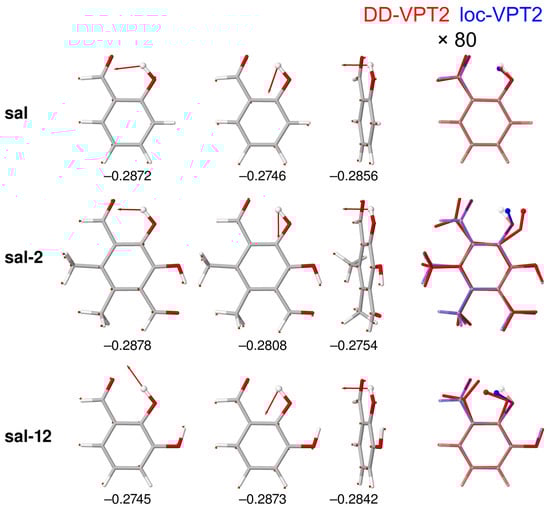 This apparent contradiction can be resolved by an analysis of for the complete molecule. Figure 11 shows the three leading difference-dedicated vibration modes and the isotope effect on the geometries for the stem compound sal as well as for sal-2, which has the largest positive (O,O) and sal-12, which shows the largest negative (O,O) among all compounds investigated. The difference-dedicated vibration modes are well localized at the H atom, and the isotope effects on the vibration amplitudes are rather uniform for the three compounds. The isotope effects on the geometries, however, vary markedly—while for sal the vibration hole is largely concentrated on the OH bond, it is delocalised over the whole C=O···HO moiety in sal-2 and sal-12 (as, to a lesser extent, for the other sal derivatives). We point out that in Figure 11, geometry changes are enhanced just by a factor of 80, as compared to factors of 400 to 10,000 in Figure 3 and Figure 7. The comparison between DD-VPT2 and loc-VPT2 geometries corroborates that the latter, as any a priori local method for these molecules, misses important features of the vibration hole and cannot be expected to provide accurate NMR isotope shifts. Also, one finds that both the whole hydroxyl group and the whole aldehyde group are involved in the geometry changes. Thus, a suitable calculation method needs to treat at least the C=O···HO moiety as flexible. A closer inspection of the geometry changes reveals that the isotopic substitution changes not only the O–H bond length but also the bond angle . In sal-2, opens upon isotopic substitution, which increases and weakens the hydrogen bond. In sal-12 (and some other compounds, including sal-1, sal-4, and sal-7), closes instead, which eventually decreases . Also, one finds that the changes both in and in are roughly the same for loc-VPT2 as for DD-VPT2. The data for and (see Tables S13 and S16) show that this holds for all compounds: the slope for the loc-VPT2 vs. DD-VPT2 values is 0.722 for and 0.860 for , the regression coefficients are 0.9885 and 0.9872, respectively. In other words, the variation of and across the compounds is about 30% and 15%, respectively larger in DD-VPT2 than in loc-VPT2.