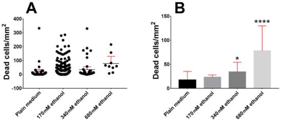 The graphs in Figure 2A,B show the effects of 1:100, 1:50, and 1:25 ethanol in medium (corresponding to 170, 340, and 680 mM, respectively) on the density of dead cells after PI staining (# cells stained with PI/mm2). Notably, the density of dead cells (mean ± 95% CI) raised from 17.56 ± 17.73 in plain medium, to 23.47 ± 8.76 (170 mM ethanol), 34.24 ± 2.30 (340 mM ethanol), and 78.11 ± 22.41 (680 mM ethanol).