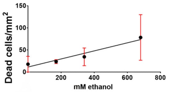 Linear regression curve of the density of dead cells related to different ethanol concentrations in culture media. Dead cells were stained with propidium iodide and results are expressed as means of dead cells/area. The curve demonstrates a positive correlation between the concentration of ethanol in medium and the density of dead cells. Slope was significantly non-zero: F = 30.55, P value = 0.0312. Equation: Y (dead cells/mm2) = 0.09141 × (ethanol concentration) + 11.15. Bars indicate 95% CI.