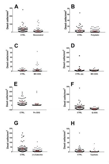 Descriptive exploratory statistics of the effect of different polyphenols (A = resveratrol; B = polydatin; C = Mv-3OG (malvidin 3-O-glucoside); D = aqueous medium-dissolved Mv-3OG; E =Pn-3OG (peonidin 3-O-glucoside); F = Q-3OG (quercetin 3-O-glucoside); G = (+)-catechin; H = taxifolin) on cerebellar naturally occurring neuronal death (NOND). Dead cells were stained with propidium iodide and results are expressed as means of dead cells/area with 95% CI. Scatter graphs show the dispersion and variability of data. Abbreviations: CTRL = control medium containing 170 mM ethanol; CTRL (w) = control medium (aqueous).