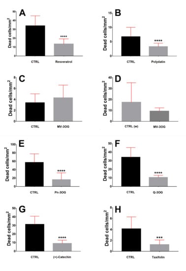 We have statistically tested the effects of PPs onto cerebellar NOND using two-tailed Mann–Whitney tests (Figure 4 and Figure 5). Statistics demonstrated that all PPs, except Mv-3OG (Figure 5G,H), were capable to reduce the density of dead cells in cerebellar cultures, with high significance.