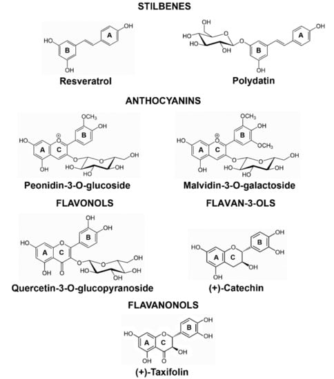 PPs of potential biomedical interest belong to several chemical families among which the most widely studied are stilbenes, anthocyanins, flavonols, and flavan-3-ols.