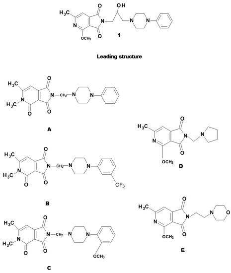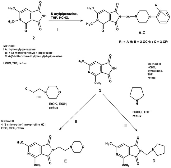 The main line of analogues was based on the structure of 4-alkoxy-1H-pyrrolo(3,4-c) pyridine-1,3(2H) -dione. Optimal biological properties in the behavioral tests showed imide1: 4-alkoxy-N- [3- (N-phenyl-4-piperazinyl) -2-hydroxy] propyl-1H-pyrrolo (3,4-c) pyridine-1, 3(2H)-dione. One of the structure modifications is the assumption of shortening to two (E) or one (D) methylene groups of the alkyl linker between the 2-methoxy-3,4-pyridinedicarbox imide moiety and the arylamine residue. In order to obtain D and E derivatives, commercial preparations of 4-(2-chloroethyl)-morpholine and pyrrolidine were used, condensing the potassium salt of imide 3, under the influence of potassium ethoxylate in anhydrous ethanol (method II, Scheme 1; E), or in the Mannich reaction-THF-solvent and formalin (method III, Scheme 1; D). The reaction yield was 50% (E) and 60% (D).