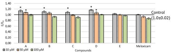 All compounds tested inhibited both COX-1 and COX-2 activity (Table 1). In the case of compounds A and D, COX-1 inhibition was stronger compared to meloxicam, which was the reference compound. Compounds with COX-2 inhibitory activity (except for C) showed higher activity than meloxicam. Most compounds tested (except for D) showed stronger COX-2 selectivity than meloxicam. The IC50 values obtained for meloxicam are significantly higher than those published by Ogino et al. [19]. However, it was an in vivo study in rats, and we performed only the enzymatic assay. IC50 values for tested compounds are similar to those of meloxicam. Therefore in the next stage of research, it is planned to conduct in vivo tests to check the anti-inflammatory properties and gastrointestinal toxicity of the most promising compound E.