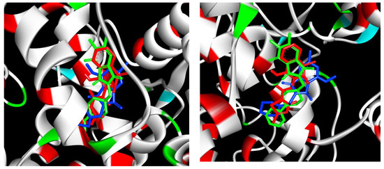 Docking poses of A (green), C (blue-left), D (blue-right) and meloxicam (red) inside COX-1 active site (left) and COX-2 active site (right).