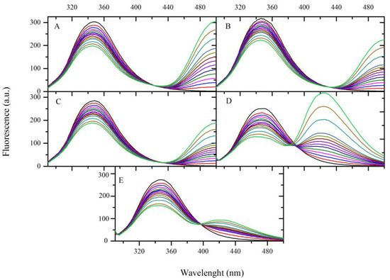 The steady-state fluorescence spectroscopy and the synchronous fluorescence spectroscopy were used to study fluorescence quenching of BSA by compounds A–E. The fluorescent behavior of BSA is due to the amino acid residues: Trp, Tyr, and Phe. However, Trp residue has the strongest fluorescence intensity. Thus, the two Trp residues of BSA are mainly responsible for its fluorescence. The fluorescence spectra were recorded for BSA in the presence of studied compounds at the excitation wavelengths λ = 280 nm (both Trp and Tyr residues are excited) and concentration range 0.0–5.0 µM. The fluorescence emission spectra for all tested compounds were shown in Figure 5. The fluorescence intensity of BSA was decreased with increasing concentration of compounds A–E. The presence of A–E not only quenched the fluorescence of BSA, but it also caused a blue shift in the maximum emission wavelength of protein. For that, a strong fluorescence emission band at 349 nm, was observed. A careful analysis of the spectra discloses that at a lower concentration of A–E (A–E/BSA molar ratio 0.2–2:1), its shift is rather slight, up to 1.5 nm. In the medium range of concentration, change in λmax is more evident. A large change in λmax in the presence of a high concentration of A–E (A–E/BSA molar ratio 5:1) indicates the unfolding of the polypeptide backbone of macromolecule [21]. The blue shift effect expressed that the conformation of BSA was changed. It also indicated the amino acid residues are located in a more hydrophobic environment and are less exposed to the solvent [22]. Fluorescence quenching and shift of λmax identifies interaction with BSA and can suggest the formation of complexes (static quenching). However, it can also be the result of the collisional encounters (dynamic quenching). In order to confirm the quenching mechanism and complex formation, the fluorescence data were further analyzed by the Stern–Volmer equation and dependence on temperature.