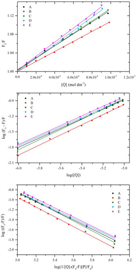 where F0 and F are the steady-state fluorescence intensities at the maximum wavelength in the absence and presence of quencher, respectively, kq the quenching rate constant of the biomolecule, τ0 the average lifetime of the biomolecule, [Q] is the quencher concentration, and Ksv is the Stern–Volmer constant. For determining the type of quenching liner fitting was analyzed (Figure 6). The average lifetime of the fluorophore in the excited state for a biomolecule is 10−8 s [24]. According to Equation (2), the Stern–Volmer constant and the quenching rate constants were obtained from the linear fitting of the experimental data. Received data are collected in Table 4. For dynamic quenching, the maximum scatters collision quenching constant of different quenchers with the biopolymers was reported to 2 × 1010 dm3·mol−1·s−1 [25]. The results showed that the value of kq for all cases is much greater, which indicated that the probable quenching mechanism of fluorescence of BSA by A–E is not caused by a dynamic collision but from the formation of a complex.