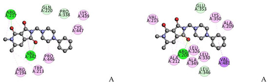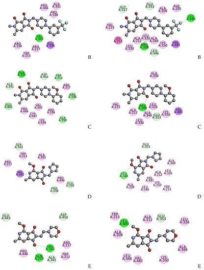 In order to determine the preferred binding sites of the compounds A–E on BSA, the binding interactions were simulated by the molecular docking method. The simulated results were presented in Table 8. As is well known, the more negative the binding free energy ΔG°, the more stable the formed complex is. The results revealed that the binding free energy for A–C within the hydrophobic cavity in site II (subdomain IIIA) of BSA was more negative than that within the hydrophobic cavity in the site I (subdomain IIA). This indicating that site II is favorable. For D and E, the binding free energy ΔG° within site I and site II are close to each other. It indicates that both site are favorable. This result is consistent with the results observed in the site marker fluorescence studies. As presented in Table 8, the sum of van der Waals energy, hydrogen bonding energy, and desolvation free energy (ΔE2) is more negative than electrostatic energy (ΔE3). Hence, it can indicate that the main interactions between compounds A–C and BSA are van der Waals and hydrogen bonding interactions. Our thermodynamic studies also indicated that van der Waals and hydrogen bonding contributed to the interaction of the BSA-tested compound. In binding sites, II studied compounds insert into the hydrophobic cavity are surrounded by various kinds of residues (Figure 8). Hydrogen bonds with Arg208, Leu480 are formed. In the site, I pocket also hydrogen bonds are formed (Arg-217, Gly-220, Val-342). The π-sigma and other hydrophobic interactions are observed. Tryptophan residue (Trp-213) is close to tested compounds. The details are presented in Figure 8.