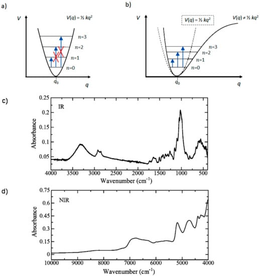 (a,b) Vibrational potential, vibrational levels and transitions of diatomic (i.e., one-dimensional) oscillator in (a) harmonic approximation, and (b) its real (anharmonic) nature, (c,d) comparison of infrared (IR) (c) and near-infrared (NIR) (d) spectra of the same sample (wood of Douglas fir species). The symbols denote: V—the potential energy; q—vibrational coordinate; k—force constant; n—vibrational quantum number. Panels (c,d) reproduced with permission from Springer Open, Ref. [16].
