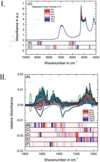Dissection of the PLS regression vectors developed by Henn et al. [33] for prediction of blood constituents from NIR absorbance (I.A) and IR difference (II.A) spectra of a 5-component model mixture in artificial dialysate solutions. Relative (to the maximum value) intensity of the regression vector for glucose (B) and urea (C), lactate (D), phosphate (E) and creatinine (F). Adapted in agreement with CC BY 4.0 license, Ref. [35].