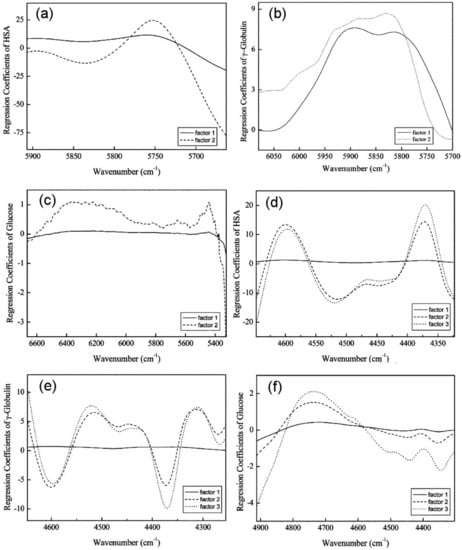 The structure of PLS regression coefficients vectors for simultaneous determination of HSA (a,d), γ-globulin (b,e), and glucose (c,f) concentrations from NIR spectra of model solutions developed by Kasemsumran et al. Ref. [36]. Reproduced with permission from Royal Chemical Society, Ref. [36].