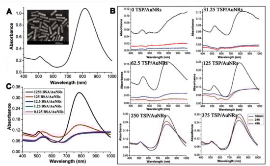 UV-vis-NIR spectrum of AuNRs suspension in water (A). Spectra of gold nanorods (AuNRs) dispersed in serum containing media (SCM) with 0–30% of fetal bovine serum (FBS) and different incubation times (B). Spectra of bovine serum albumin (BSA)/AuNRs samples (C). Reproduced in agreement with CC BY 4.0 license from Ref. [46].
