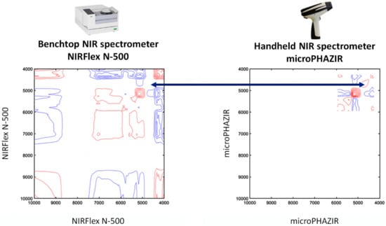 A visual assessment and evaluation of the chemical sensitivity profiles of NIR spectrometers (reference benchtop vs. handheld) by two-dimensional correlation spectroscopy (2D-COS).