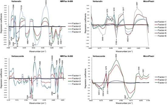PLS regression coefficients plots for the best performing calibration models for verbenalin and verbascoside content in Verbena officinalis samples. The models were constructed for NIR spectra measured on NIRFlex N-500 (benchtop) and microPhazir (miniaturized) spectrometers. Reproduced with permission from Elsevier, Ref. [77].