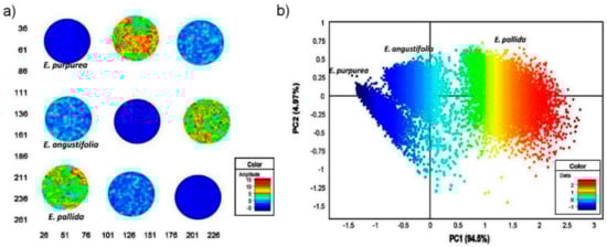 The potential of NIR spectral imaging for analysis of plant tissues. As they are micro-structured samples, the ability to simultaneously provide chemical and topological information finds a particular usefulness here. As an example, NIR spectral imaging is powerful asset in quality control of natural drugs. This potential has been demonstrated by Sandasi et al. by their method developed for authentication of Echinacea based medicines appearing on the pharmaceutical market [80]. Echinacea species are often included in various formulations to treat upper respiratory tract infections. The study involved three species, E. angustifolia, E. pallida and E. purpurea, acquired from local market in South Africa. By employing NIR hyperspectral imaging operating in the range 10,870–3978 cm−1 (920–2514 nm), with aid of PCA it was possible to clearly discriminate between the three Echinacea species from the leaf and root material (Figure 9). The method accurately predicted the raw material content in several commercially available products and identified products that did not contain crude Echinacea material as well.