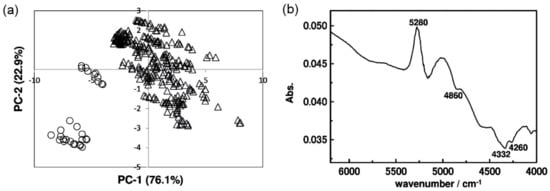 PCA scores plot of NIR spectra of yolk measured over the development time of Oryzias latipes embryo (a). Δ indicates the data collected from the first to the tenth day and ⚪ denotes data collected at the day before hatching. Loadings plot of PC-1 (b). Reproduced from Ref. [83] in agreement with CC BY 4.0 license.