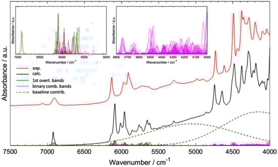 Insight into origins of the NIR spectrum available from quantum chemical calculation on the example of a short chain fatty acid (vinyl acetic acid). Note, all bands are presented in common intensity scale (two inside panels present scaled-up intensity). This demonstrates well the convoluted nature of NIR spectra, which results from strongly overlapping numerous weak bands. Reproduced with permission from Ref. [91]. Copyright (2017) American Chemical Society.