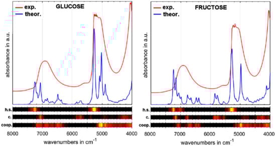 NIR spectroscopy has typically been limited by the complexity of the spectra limiting the method’s chemical specificity. This factor is further enhanced in the case of complex biological samples. Even isolated biomolecules have complicated NIR spectra and it is difficult to assign their bands in detail. Recently, progress in applicability of anharmonic quantum chemical calculations to theoretically predict NIR spectra has been reported [9]. This yields significantly improved interpretation of the complex NIR spectra, including biomolecules. In addition, NIR spectra of several biomolecules were successfully reproduced with these methods and their absorption bands were comprehensively explained [9,91,92,93,94]. This approach was also helpful in interpreting the meaningful wavenumbers in PLS regression models of bio-active compounds in plant medicines. The potential stemming from spectra calculation may essentially enhance the inherently inferior chemical specificity, which is one of the few properties of NIR spectroscopy at which it exemplifies a great room for improvements in comparison with IR or Raman spectroscopy. Selected examples relevant to the reviewed topic are presented in the following sub-sections.