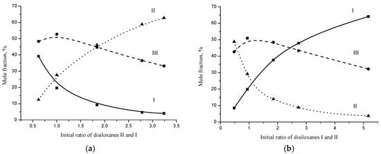 Composition of the reaction mixture (after 6 h at 60 °C) at different initial molar ratios of symmetric disiloxanes (a—II/I, b—I/II) according to GLC data (numbers I–III correspond to the structures in Figure 1).