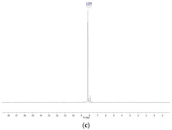 The cleavage of the siloxane bond is confirmed by 29Si NMR spectroscopy data (Figure 4a,b). A set of peaks in the range of +15 to −23 ppm in the NMR spectra of the products obtained in attempt to directly synthesize the chloride precursors of ILs 7 and 9 indicates the presence not only of various silanols, alkoxysilanes, and disiloxanes, but also siloxane oligomers [53,59]. Confirmation of the influence of the induction effect of cations on the hydrolytic stability of the organosilicon linker is a significantly smaller number of peaks in the NMR spectrum of reaction products when trying to directly synthesize chloride IL 9 with an asymmetric linker (Figure 4b). However, when siloxane precursor with 3-chloropropyl groups was used instead, the quaternization reaction with 2-hydroxyethylimidazole proceeds with formation of only the stable target product (chloride precursor of IL 8). A single peak at 8.17 ppm, corresponding to silicon atoms in a disiloxane linker with propylene spacers, is characteristic of the 29Si NMR spectrum of the reaction product (Figure 4c).