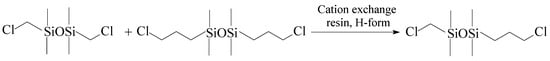 The disproportionation reaction of symmetrical disiloxanes proceeds by the mechanism of hydrolytic condensation in the presence of water adsorbed on the surface of strongly acidic cation exchange resin in the H+ form (Scheme 3). Purolite CT175 resin, like some other solid catalysts, is most effective when it contains 10 wt % of physically adsorbed water [20,21,22,23].