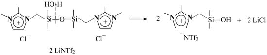 The hydrolytic instability of the siloxane linker with methylene spacers is also an issue in an attempt to perform the third stage of synthesis of bis(trifluoromethylsulfonyl)imide IL, i.e., the anion exchange in water. Ion exchange in water (the most commonly used method) involving, for example, the chloride precursor of IL 1 leads to formation of up to 50% of silanol (Scheme 7), which is obtained as a result of hydrolysis of the siloxane bond. Formation of 1,2,3-trimethylimidazolium bis(trifluoromethylsulfonyl)imide was not observed. Apparently, a fluorine-containing anion with pronounced hydrophobic properties prevents the hydrolysis of the Si-C bond during anion exchange in water.