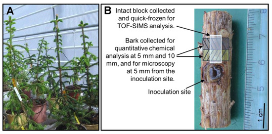 Two control saplings (C) were harvested on the day of inoculation treatment (day 0); two wounded-inoculated (W2F2) saplings were harvested at the days 7 and 17 after inoculation (i.e., DAI 7 and 17); and two control saplings (C), two wounded saplings (W4), and two inoculated samplings (F4) were sampled at 23 DAI. Small strips of bark were collected next to the wound (at the distances of 1–5 mm and 5–10 mm from the inoculation site) for quantitative chemical analysis, quick-frozen in liquid nitrogen LN2, and stored at −80 °C (see Figure 1). For the in planta chemical mapping of compounds within the phloem and bark, an intact disc of ca. 5 cm long (in the vertical direction along the stem axis) was collected (including the inoculation/wounded site on the lower end of the specimen) from the parallel inoculation/wounded site on the stem, quick-frozen in liquid nitrogen LN2, and stored at −80 °C (Figure 1).