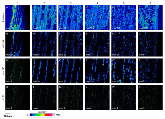 Positive ToF-SIMS images at the radial-longitudinal surface of the phloem in an older, non-treated, healthy Norway spruce tree from the cambium and non-collapsed phloem on the left (1) to the inner (2), middle (3–4), and outer (5) regions of the collapsed phloem, and the outermost collapsed phloem and periderm (6) on the right. Total secondary ions (A–F), m/z at 184 (G–L), 245 (M–R), and 291 (S–X) represent tissue structures, membranes of living cells, trans-astringin, and (+)-catechin, respectively.