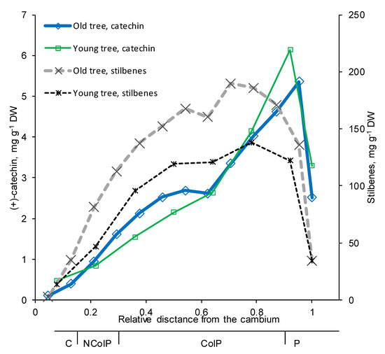 The quantitative GC and GC-MS analysis of tangential cryo-sections of phloem showed that the (+)-catechin content of mature Norway spruce phloem increased from the inner to the outer phloem, reaching the highest amount next to the cork cambium (in phelloderm; Figure 5). In dead periderm, the (+)-catechin content was clearly decreased (Figure 5). The radial patterns of (+)-catechin amounts within phloem were similar between younger (17-year-old) and older (38-year-old) trees. In contrast, stilbene glucosides astringin and isorhapontin showed higher levels of accumulation with increasing tree age (Figure 5).