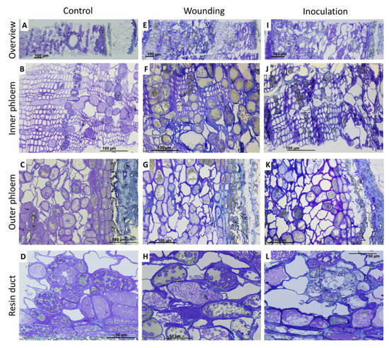 Bright field microscopy images of transverse surface of phloem in saplings of Norway spruce 23 days after inoculation: control saplings (A–D), wounded saplings (E–H), and fungus-inoculated saplings (I–L). The uppermost panels (A,E,I) show overview of phloem; panels B, F, and J show the tissues in innermost phloem (tangential rows of axial phloem parenchyma, sieve cells); the panels C, G, and K show the outermost phloem; and panels D, H, and L show the details of cellular properties. Scale bars on each figure.