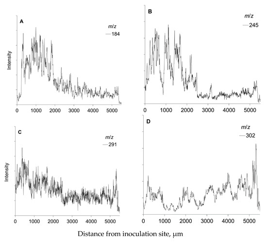 Ion intensities of m/z at 184 (A), 245 (B), 291 (C), and 302 (D) representing living cell membranes, stilbene glucoside astringin, (+)-catechin, and abietic acid, respectively, obtained from ToF-SIMS spectra of the radial-longitudinal surface of a frozen-hydrated, fungus-inoculated Norway spruce sapling. The specimen is the same as that shown in Figure 8. The ion intensity values of three consecutive pixels were averaged, and the results are shown as a function of the distance (µm) from the inoculation site.