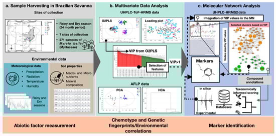 Summary of the workflow used in this study. (a) Strategy followed for sample harvesting and environmental monitoring in different regions of the Brazilian savanna. (b) Multivariate data analysis was used to analyze the chemical and genetic data and to correlate compounds with significant variation (markers) to environmental factors. (c) A multi-informative molecular network was then generated by merging metabolomics multivariate data (VIP values) in the molecular network to identify chemotype markers. Compounds were annotated by spectral matching against in silico fragmentation databases, following a taxonomically informed reranking process.