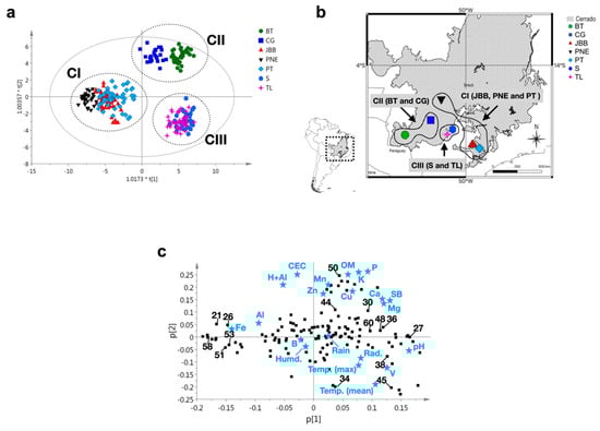 As shown in the loading plot from the O2PLS (Figure 2c), the edaphic conditions as the micronutrients iron (Fe) and exchangeable aluminum (Al), potential acidity (H+Al), and cation exchange capacity (CEC), contributed negatively to the PC1, and were correlated to the Goiás (PNE) and São Paulo (JBB and PT) regions. On the other hand, the levels of macronutrients (Mg, Ca, P, and K) and micronutrients (Cu and Mn), besides soil properties such as the sum of bases (SB) and organic matter (OM) level, were positively correlated to the Mato Grosso do Sul regions of BT and CG. Other environmental conditions such as thermal amplitudes (mean, maximum, and minimum temperatures), radiation incidence, and soil properties such as pH as well as base saturation (V), were correlated to the S and TL (Mato Grosso do Sul) regions.