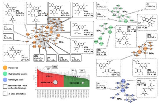 After a visual inspection of the statistically informed MN, clusters were selected based on their node size (higher nodes indicate VIP > 1.0). This resulted in the selection of five clusters, herein named MN1–MN5 (Figure 3). A total of 78 compounds were annotated among the selected clusters (Table S4). Of those, 39 compounds were identified as flavonoids, 17 as carboxylic acid derivatives, 19 as hydrolyzable tannins, and 3 as chromones.
