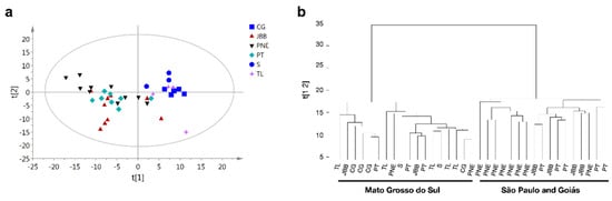 Multivariate data analysis of the AFLP markers data of Myrcia bella samples from different regions of Cerrado. (a) PCA score plot derived from 40 samples. (b) HCA plot derived from the generated PCA score plot. Both PCA and HCA highlighted the presence of two main genotype clusters. List of abbreviations: CG = Campo Grande; S = Selvíria; TL = Três Lagoas; PNE = Parque Nacional das Emas; PT = Pratânia; JBB = Jardim Botânico de Bauru.