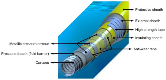 Schematic of a typical flexible umbilical cable for offshore engineering.